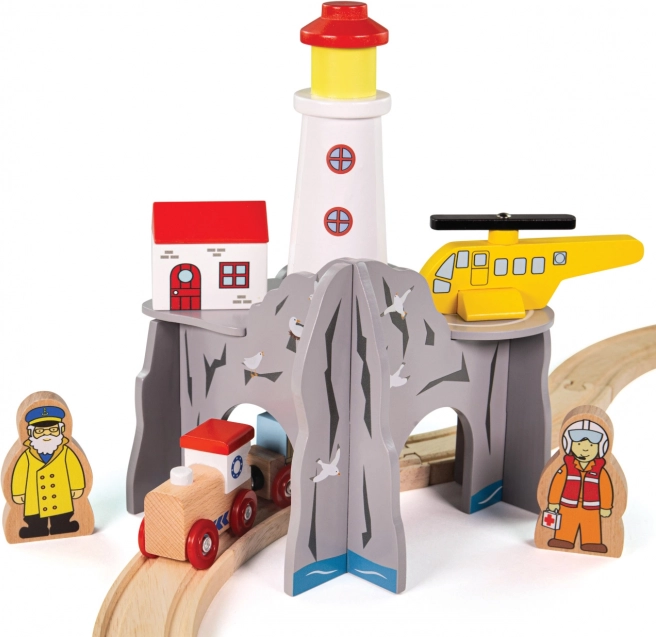 Stredobod súpravy tvorí skalnatý tunel so strážnym majákom, ktorý dodá vláčikodráhe príbehy z pobrežia a nové trasy pre vláčiky.