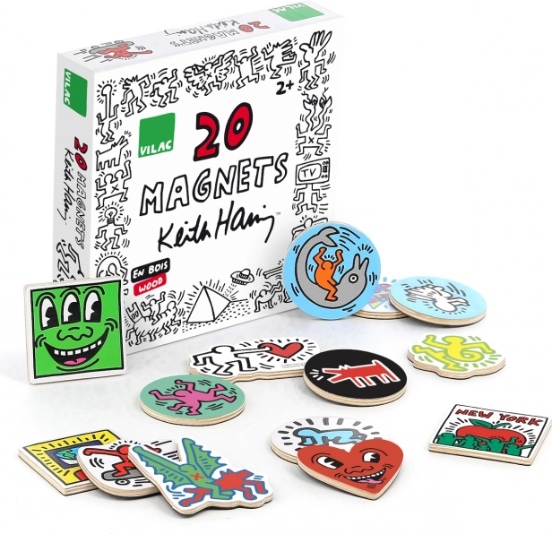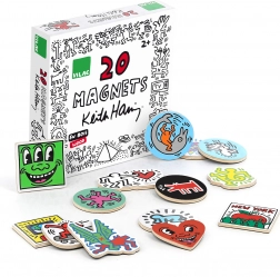 Originálna sada drevených magnetiek s ikonickými ilustráciami KEITH HARING rozžiari vašu chladničku, tabuľu aj detskú izbu. Magnetky z odolnej preglejky majú kvalitnú lesklú potlač a pevne držia na kovových povrchoch. Perfektný darček v atraktívnej darčekovej krabičke, vhodné od 2 rokov.