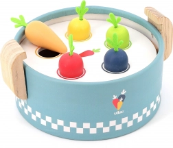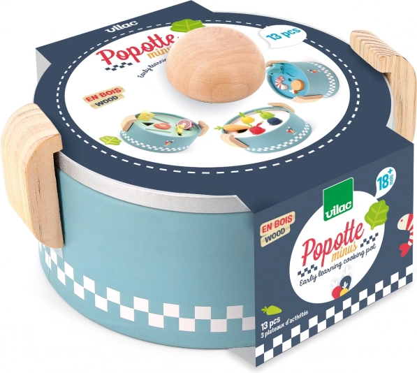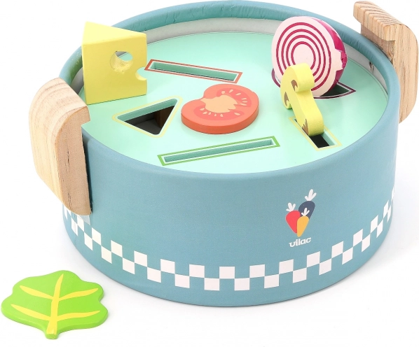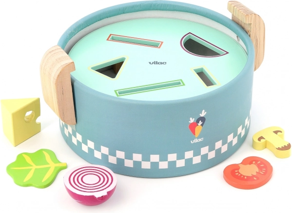 VILAC vkladací mini hrniec je šikovná drevená hračka pre najmenších od 18 mesiacov. Pod vekom sa ukrývajú tri vymeniteľné dosky s rôznymi tvarmi, do ktorých deti vkladajú alebo vhadzujú farebné kúsky potravín. Vzniká tak „varenie“ ako naozaj, ktoré rozvíja fantáziu aj praktické zručnosti.