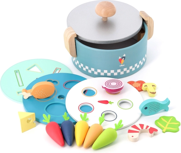 Objavte hravú vkladačku v podobe malého hrnca od značky VILAC, ktorá podporuje rozpoznávanie tvarov a farieb, rozvíja jemnú motoriku a prináša veľa kreatívnej zábavy. Vďaka 3 vymeniteľným doskám a 13 pestrofarebným ingredienciám deti trénujú koordináciu a logiku, zatiaľ čo praktické balenie zaistí ľahké uloženie všetkých dielov.