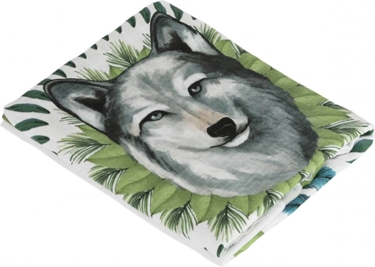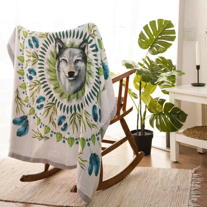 Krásny motív vlka obklopeného zelenými listami a modrými pierkami prebúdza odvahu. Dekoratívny prvok dodáva prostrediu unikátny vzhľad.