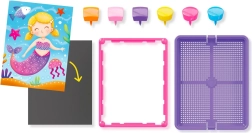 Set obsahuje všetko potrebné: odolnú zapichovaciu podložku, rám na pohodlné skladanie a úložný košík, do ktorého ľahko upracete všetkých 300 pestrých kolíčkov. Sada je ideálna na domáce tvorenie aj ako darček pre malých umelcov.