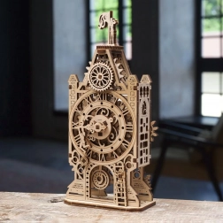 Táto precízne spracovaná 3D mechanická stavebnica z prírodnej preglejky je nielen dekoratívna, ale aj edukatívna. Otáčaním veľkého kolesa uvediete do chodu asynchrónny prevod hodinových ručičiek, kyvadlo, veternú koruhvu aj ďalšie architektonické detaily. Premyslená mechanika ponúka plynulý pohyb a názorne ukazuje, ako fungujú základné hodinové mechanizmy.