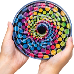 Užite si chytré hranie kdekoľvek a kedykoľvek. Toto okrúhle bludisko s kovovou guličkou ponúka tri podmanivé motívy – čiernobielu špirálu, červeno‑žltý vír a pestrofarebnú „dúhu“. Stačí jemne nakláňať hru a navigovať guličku spletitými cestičkami až do stredu. Skvelá voľba na cestovanie, do čakární aj na chvíle oddychu.