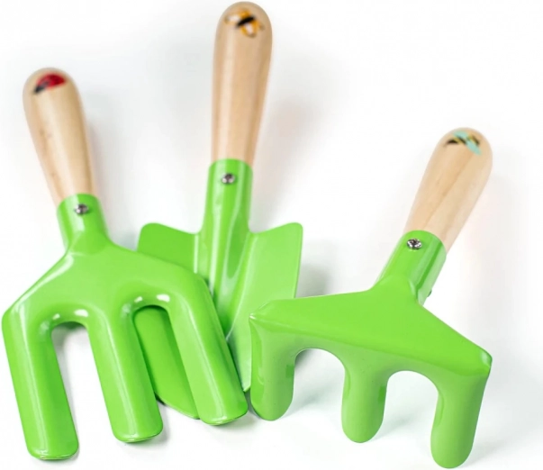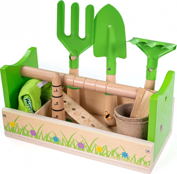 Táto farebná záhradnícka sada rozvíja detskú zručnosť, trpezlivosť a vzťah k prírode. Všetko je uložené v pevnej drevenej prepravke so sviežim zeleným dizajnom s lienkami a kvetmi. Deti si môžu bezpečne vyskúšať sadiť, kypriť či merať a pritom napodobňovať dospelých.