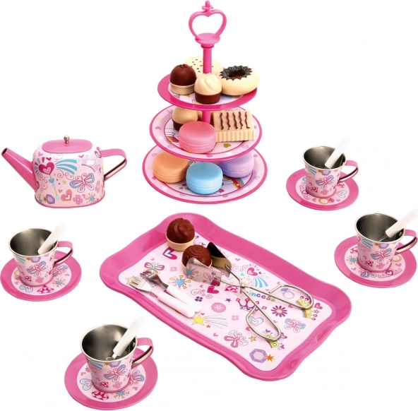 Kompletný servis s kanvičkou, šálkami, podšálkami, táckou a poschodovým stojanom na cukrovinky – všetko pre realistickú čajovú párty.