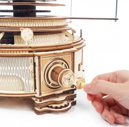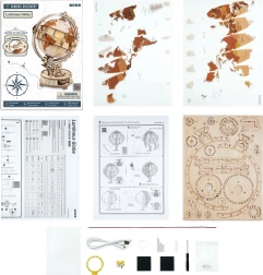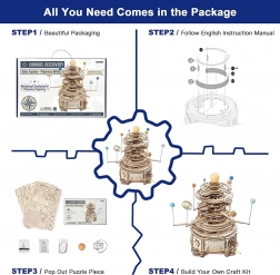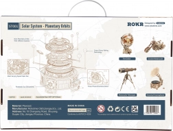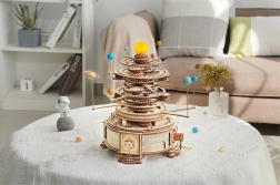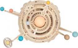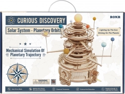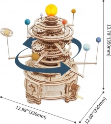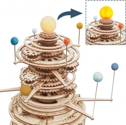 Tento detailný drevený model slnečnej sústavy kombinuje zábavu zo stavania s chytrou mechanikou. Vďaka premyslenému systému prevodov ORRERY mechanizmus simuluje rôzne rýchlosti obehu planét okolo stredu – Slnka s LED osvetlením, ktoré sa rozsvieti pri ručnom otáčaní kľukou.