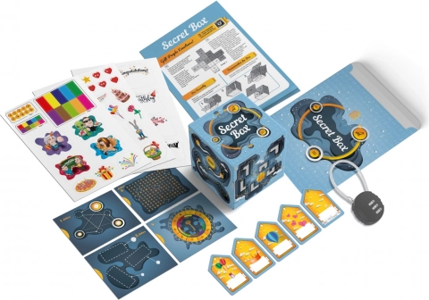 - Skladacia krabička, číselný zámok (3-miestny), 4 karty nápovedy, 3 hárky samolepiek, 5 visačiek