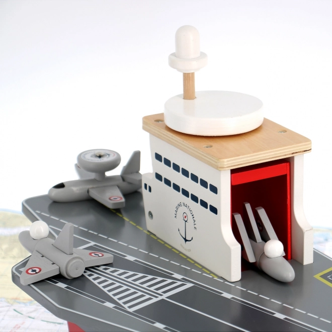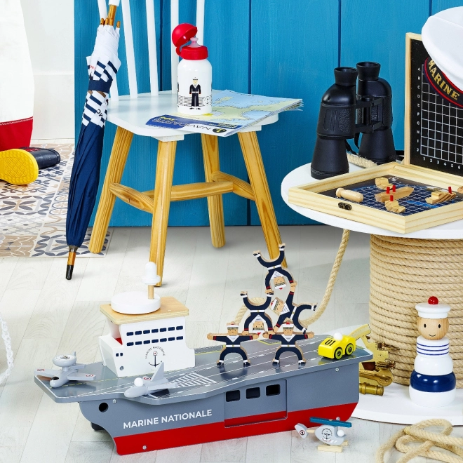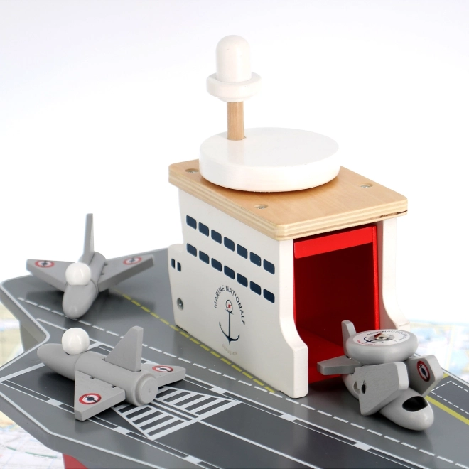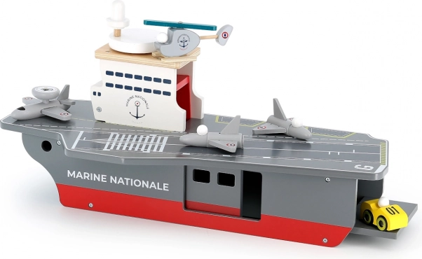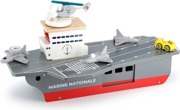 Táto precízne spracovaná drevená lietadlová loď verne napodobňuje skutočné nosiče lietadiel vrátane označenia Marine Nationale. Je vyrobená z odolnej, a pritom ľahkej preglejky, takže je stabilná a pohodlne sa s ňou manipuluje aj menším deťom. Realistické maľované detaily a premyslené prvky podnecujú predstavivosť a prinášajú autentický námorný zážitok.