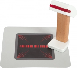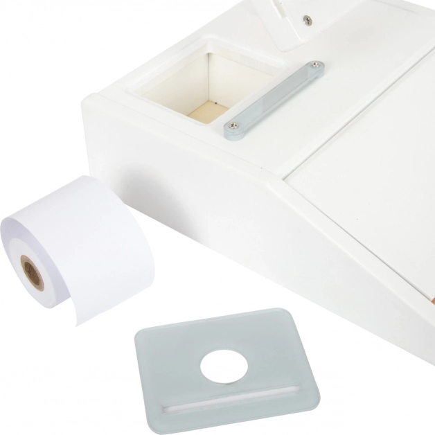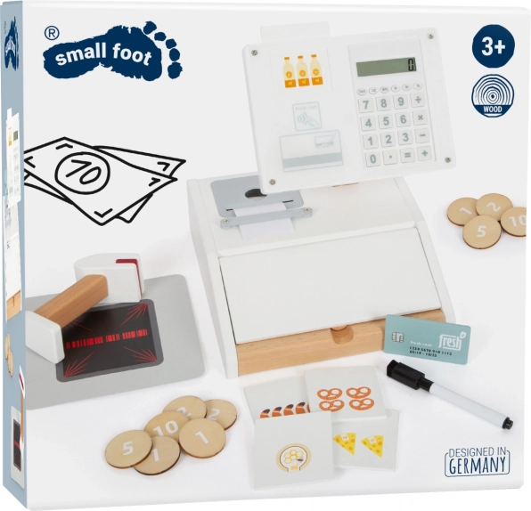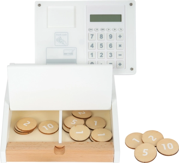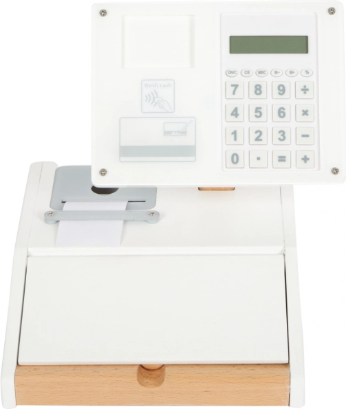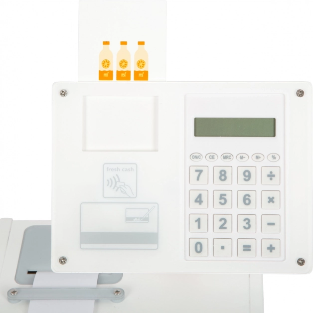 Drevená registračná pokladňa SMALL FOOT Fresh premení každý detský kútik na malý supermarket. Vďaka integrovanej kalkulačke v otočnom monitore deti ľahko spočítajú nákup, otvoria veľký šuplík s priehradkami na mince a vyskúšajú si bezhotovostnú platbu s vlastnou kartou a podpisom na plexiskle.