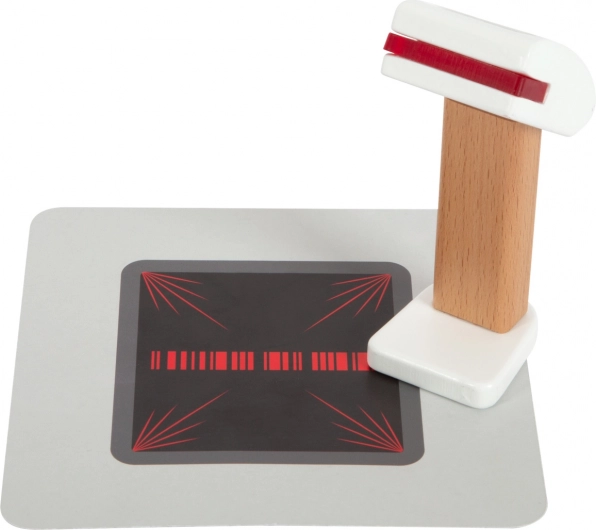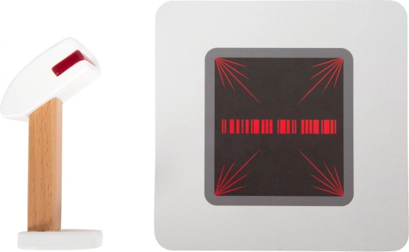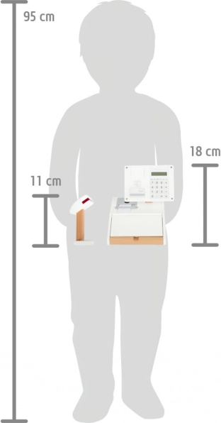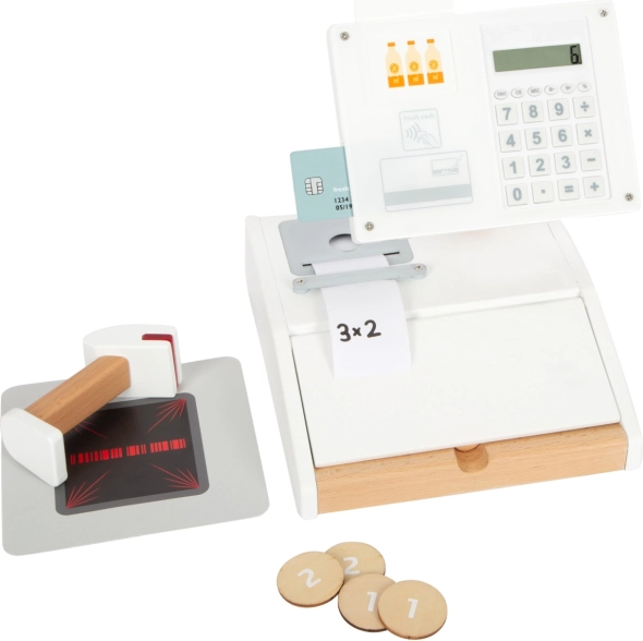 Súčasťou sú produktové kartičky, čítačka čiarových kódov, trhacia rola účteniek, skener a 15 obojstranných drevených mincí. Kombinácia dreva a plastu zaručuje odolnosť aj príjemný severský dizajn s priznanou kresbou dreva. Pokladňa podporuje učenie počítania, rozvoj fantázie a sociálnu interakciu pri hre na obchod.