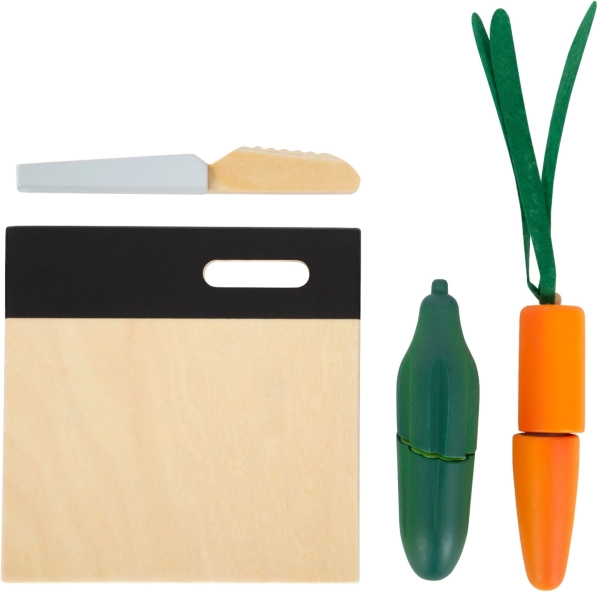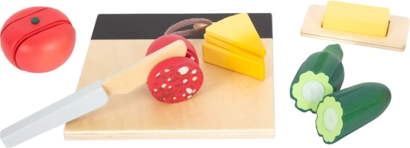 Táto kvalitná sada z robustného dreva prináša všetko, čo malí kuchári potrebujú: doštičku s možnosťou písania kriedou, bezpečný drevený nôž a bohatý výber potravín – paradajka, uhorka, mrkva, jablko, banán, syr, salám, maslo a pečivo. Jednotlivé diely držia pohromade pomocou suchého zipsu, takže ich deti môžu znova a znova „krájať“ a skladať.