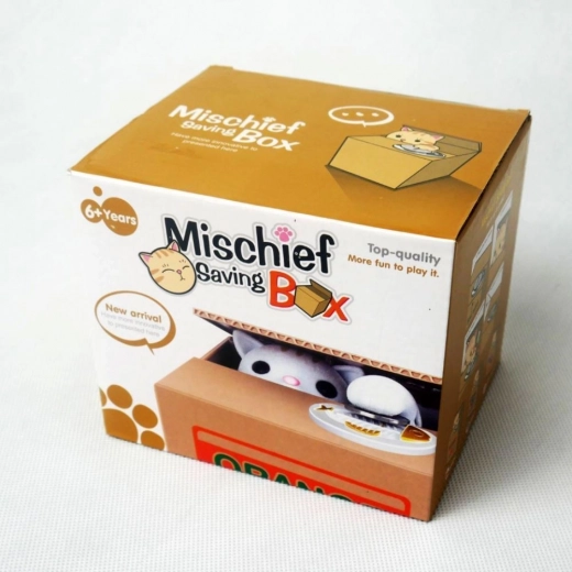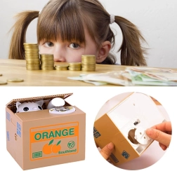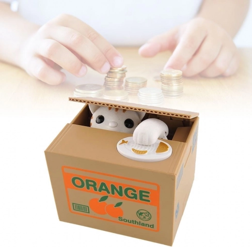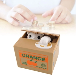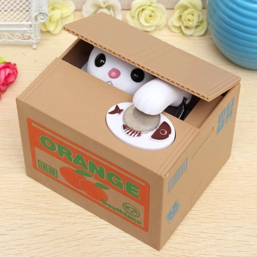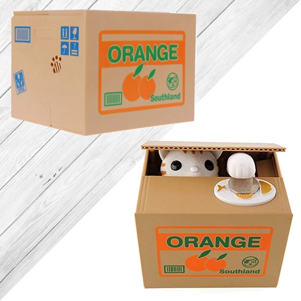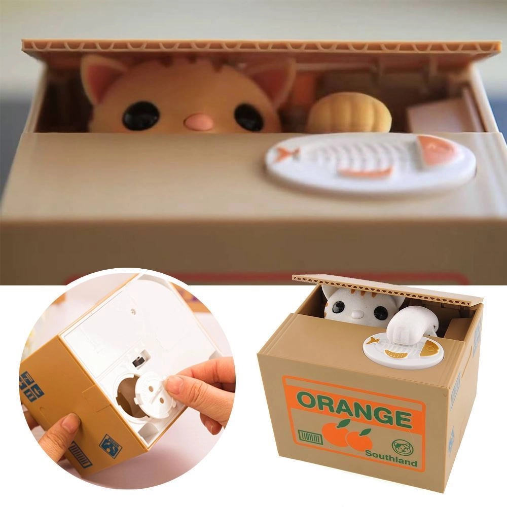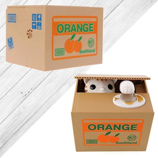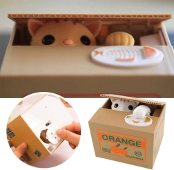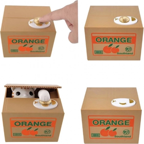 POHYBUJE SA - mačička sa vykloní z krabice, vezme mincu a schová sa dovnútra