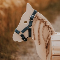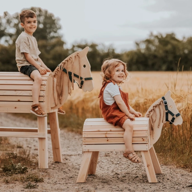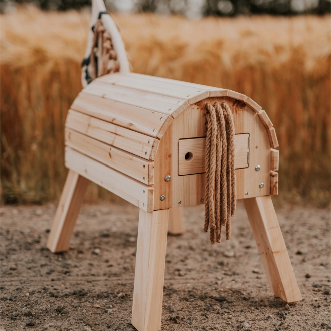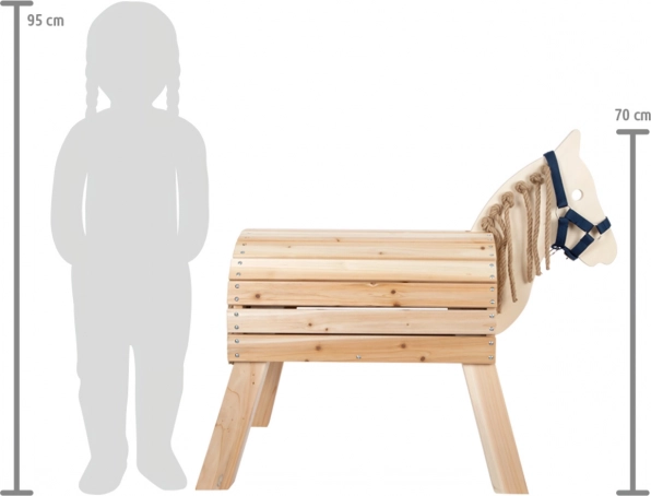 Detský drevený kôň je vyrobený z odolného neošetreného dreva, ktoré je možné podľa potreby ošetriť ochranným lakom. Výška chrbta koňa je 50 cm, čo umožňuje ľahký prístup aj menším deťom. Kôň stojí na stabilných nohách, vďaka čomu je bezpečný pri hre doma aj vonku. Súčasťou balenia je ohlávka, ku ktorej je možné pripojiť vodiace lano pre väčšiu interakciu pri hre. Drevený kôň podporuje rozvoj predstavivosti a jemnej motoriky detí vďaka sisalovej hrive a chvostu, ktoré môžu splietať a česať.