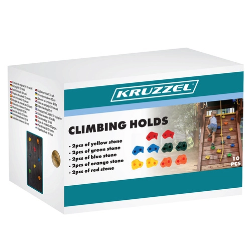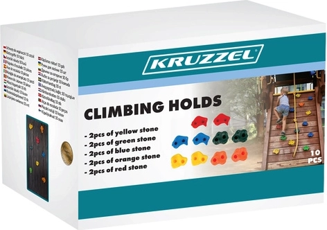 Chyty KRUZZEL sa montujú na 2 skrutky, čo zabraňuje ich otáčaniu a zvyšuje bezpečnosť pri používaní. Textúrovaný, protišmykový povrch zaisťuje istotu pre ruky aj nohy. Rôzne tvary a veľkosti umožňujú viac možností uchopenia podľa spôsobu priťaženia. Skvelé na stavbu lezeckých stien, rebríkov, veží a ďalších konštrukcií.
