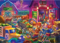 Farebná scéna plná detailov – stodola s nápisom For Sale, hospodárske zvieratá, starý nákladiak s úrodou aj sezónne dekorácie. Ideálne pre milovníkov vidieckych motívov a prepracovaných ilustrácií.