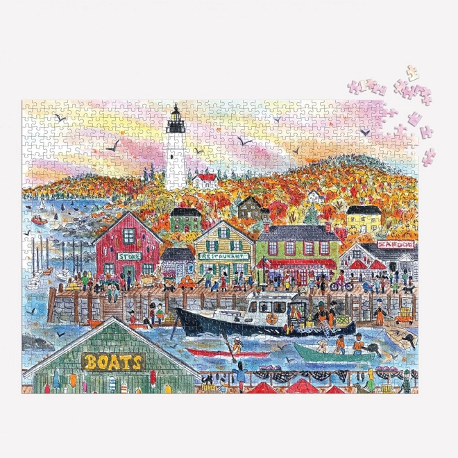 Vychutnajte si farebné lístie, maják a živý prístav zachytené oceňovaným ilustrátorom Michaelom Storringsom. Motív je plný detailov, ktoré je radosť objavovať pri každom skladaní.