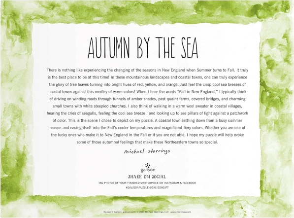 Vychutnajte si čaro pobrežného mestečka v prvých jesenných dňoch s umeleckým puzzle Jeseň pri mori od GALISON. Ilustrácia od Michaela Storringsa poteší hrejivými farbami a množstvom detailov, ktoré zaručia príjemnú výzvu. Kvalitný kartón z recyklovaných materiálov, matná povrchová úprava a nezávadná potlač prinášajú prémiový zážitok zo skladania. Rozmer zloženého obrázka je 69 × 51 cm, vhodné od 8 rokov.
