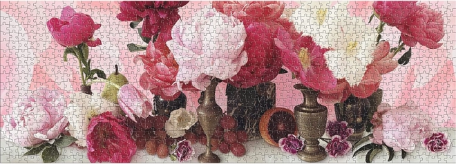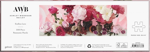 Panoramatické puzzle Endless Love prináša elegantné kvetinové zátišie plné tulipánov a pivoniek v jemných odtieňoch ružovej a zelenej. Vďaka prvotriednej tlači a matnému povrchu vyniknú detaily aj sýtosť farieb, takže skladanie je rovnako krásne ako hotový obraz. Autorkou je americká výtvarníčka a fotografka Ashley Woodson Bailey, preslávená svojimi vycibrenými botanickými kompozíciami.