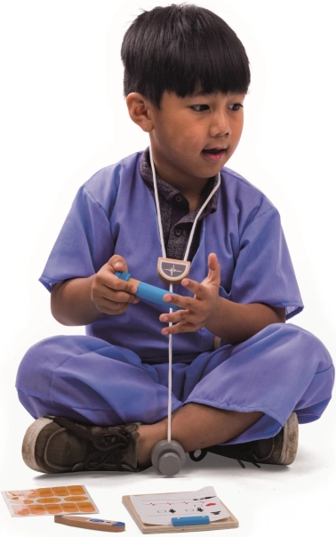Detský lekársky kostým od BIGJIGS TOYS premení každú hru na záchranársku misiu. Súčasťou je modré tričko a nohavice so suchými zipsami pre ľahké obliekanie aj vyzliekanie, a tiež bohaté príslušenstvo: drevený stetoskop, lekárska podložka na poznámky, teplomer, vreckové hodinky, injekčná striekačka a náplasti. Kostým je vyrobený z bavlny a polyesteru a možno ho prať v práčke.