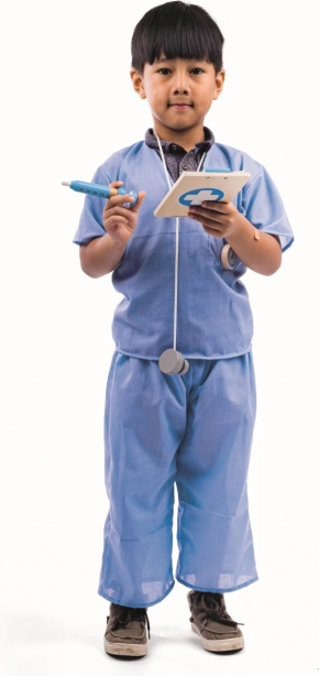 - Tričko, nohavice, drevený stetoskop, lekárska podložka, teplomer, vreckové hodinky, injekčná striekačka, náplasti