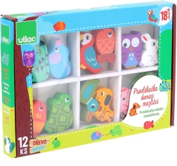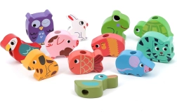 Krásna drevená prevliekačka s motívmi zvieratiek na rozvoj jemnej motoriky dieťaťa. Obsahuje 12 farebných ilustrovaných korálok a textilnú šnúrku.
