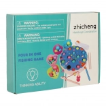 - Rôzne herné režimy: magnetické lovenie rybičiek a húseníc, prenášanie pinzetou/paličkami, triedenie farieb, jednoduché príklady s číslami, cvičenie počítania formou stolovej hry.