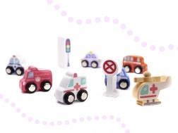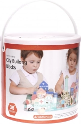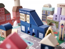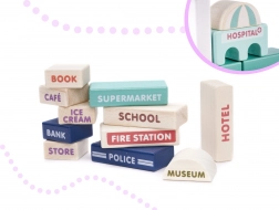 Bohato farebné drevené kocky predstavujú rôzne budovy a vozidlá, čo deťom umožňuje rozvíjať ich predstavivosť a jemnú motoriku.