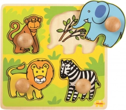Keď deti vložia všetky dieliky na správne miesto, vznikne živý obrázok safari. Vďaka veľkým úchytom sa dieliky dobre držia aj najmenším rúčkam a skladanie motivuje k pomenúvaniu zvierat, rozširovaniu slovnej zásoby a k tréningu koordinácie ruka–oko.