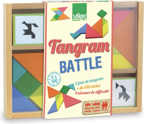 Súboj tangramov od značky VILAC je rýchla a napínavá stolová hra, ktorá rozvíja logiku, koncentráciu a tvorivosť. Cieľom je čo najrýchlejšie poskladať farebné dieliky do siluety zobrazenej na kartičke. Vďaka rôznym stupňom náročnosti si hru užije celá rodina.