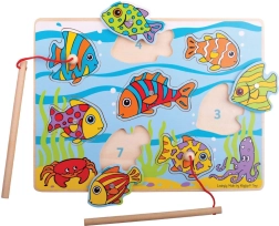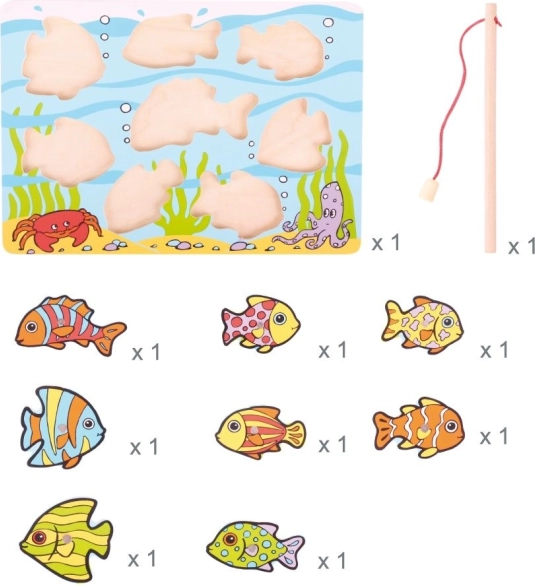 Zábavná drevená hra pre najmenších, kde deti pomocou magnetickej udice chytajú pestrofarebné rybky a vracajú ich do správnych otvorov. Podporuje jemnú motoriku, koordináciu oko–ruka a sústredenie. Vyrobené z kvalitného dreva zo zodpovedných zdrojov, spĺňa európske bezpečnostné normy. Balenie obsahuje 10 dielov.