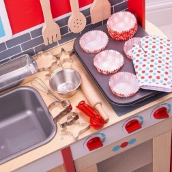 Táto komplexná sada na pečenie obsahuje všetko vybavenie, ktoré každý malý kuchár potrebuje pre svoje prvé pečenie. Vrátane plechu na pečenie, chnapky, formy na bochník, šľahacej metly, dreveného valčeka, misky, sady odmerných lyžíc a šiestich vykrajovačiek na pečivo.