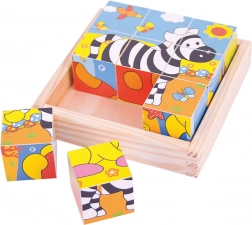 Deväť drevených kociek vytvorí šesť rôznych obrázkov. Otočte každú kocku a poskladajte obrázok, alebo ich premiešajte pre zábavu! Každý kus je vyrobený tak, aby uľahčil dvíhanie, uchopenie a skúmanie v malých rukách.