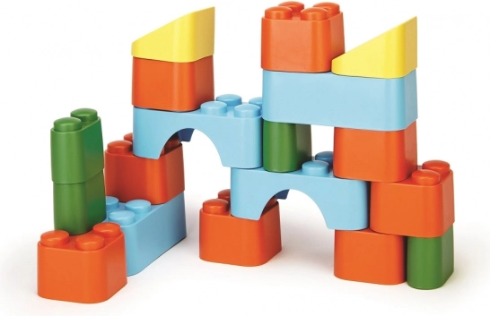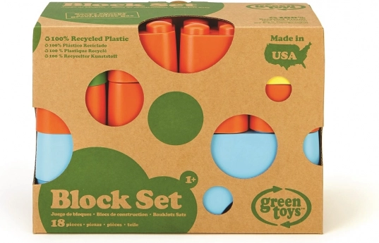 Ekologická stavebnica Green Toys – 18 bezpečných kociek z recyklovaného plastu. Ľahké, pevné, bez PVC, BPA a ftalátov. Vhodné od 6 mesiacov.