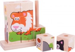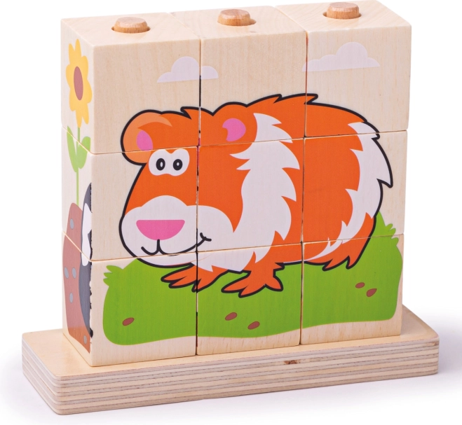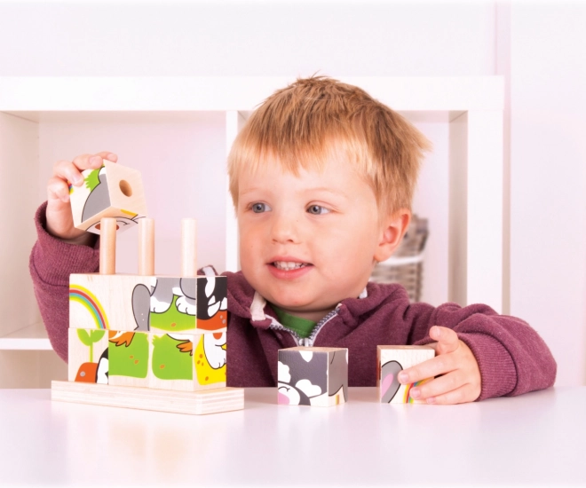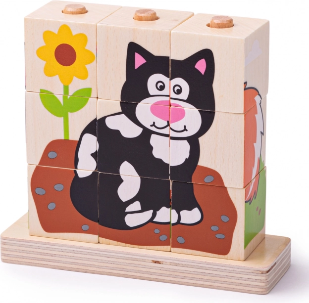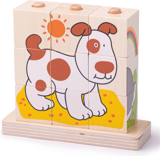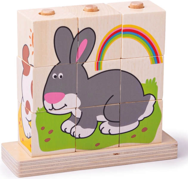 Sada obsahuje celkom 10 dielikov – 9 kociek, ktoré vytvoria 4 rôzne obrázky, a drevenú základňu s tyčkami pre bezpečné a prehľadné skladanie. Hračka je vyrobená z odolného dreva s hladkým povrchom a spĺňa aktuálne európske bezpečnostné normy.