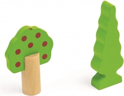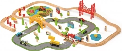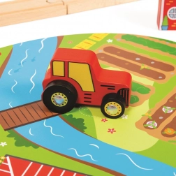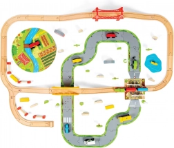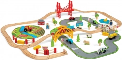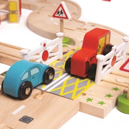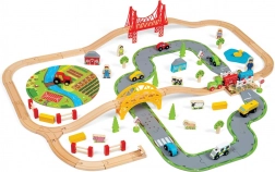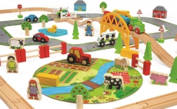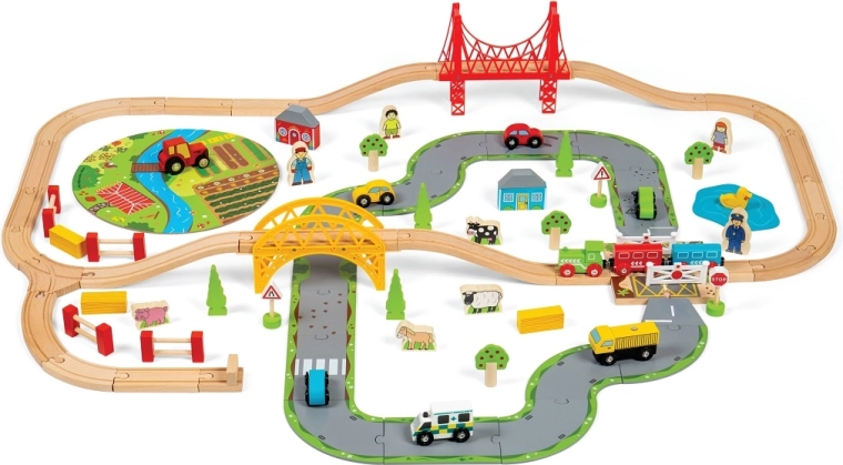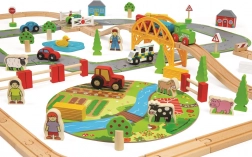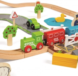 Tato drevená vláčkodráha s vidieckou cestou je perfektným prepojením vláčkodráhy a autodráhy, ktoré napodobňujú skutočný dopravný svet. Vďaka mostom a priechodom sa vaše deti dostanú do sveta plného zábavných dobrodružstiev. Všetko je doplnené miestnymi doplnkami ako je farma, budovy a stromy, ktoré skrášľujú okolie.