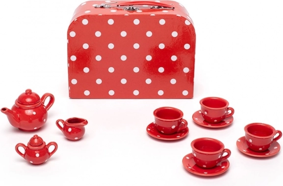 Usporiadajte dokonalú detskú čajovú párty s týmto kúzelným setom v červenej farbe s bielymi bodkami. Súprava obsahuje všetko, čo malí hostitelia potrebujú – kanvicu, 4 šálky s podšálkami, cukorničku a džbánik na mlieko. Všetko sa po hraní ľahko uloží do pevného kufríka, takže je set ideálny aj na cesty. Vyrobené z kvalitných materiálov a v súlade s európskymi bezpečnostnými normami.