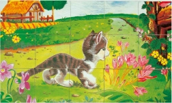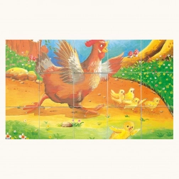 Deti zložia obrázky husí pri potoku, šteniatka na lúke či prasiatok pri chlieviku – pestré farby a milé ilustrácie podporujú fantáziu a spoznávanie zvierat.