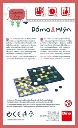 Užite si klasické strategické hry kdekoľvek na cestách. Kompaktná sada od značky Dino ponúka obojstranný herný plán pre dámu aj mlyn, spoločné čierne a biele kamene a praktické balenie do batohu. Skvelo zabaví deti aj dospelých a rozvíja logické myslenie, taktiku a trpezlivosť. Vyrobené v ČR, držiteľ certifikácie Bezpečná a kvalitná hračka.