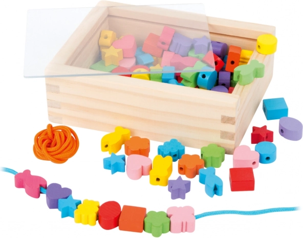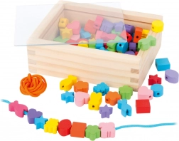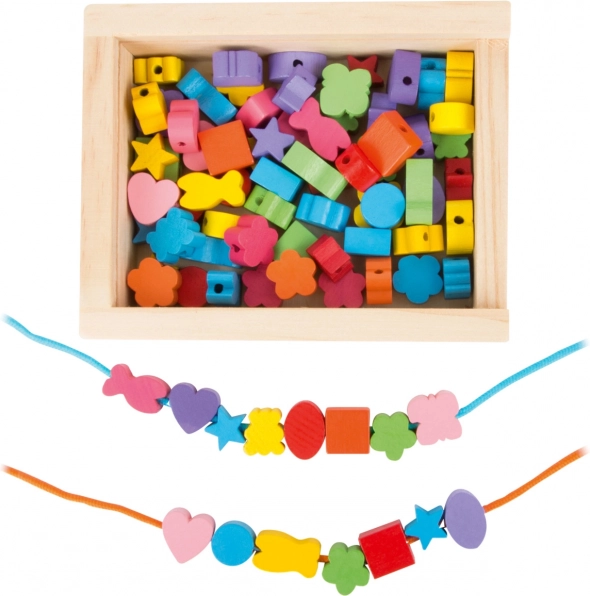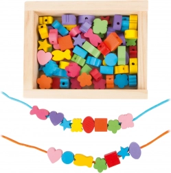 Malí tvorcovia si môžu s touto drevenou sadou užiť hodiny zábavy. Krabička obsahuje 81 farebných korálok a 2 šnúrky, ktoré dovolia deťom vytvárať rozmanité šperky podľa ich predstáv.