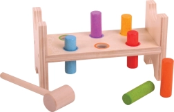 Zatláčanie farebných kolíkov kladivkom posilňuje úchop, presnosť a koordináciu ruka–oko – ideálne pre prvé motorické výzvy.