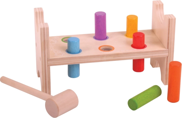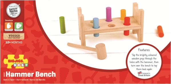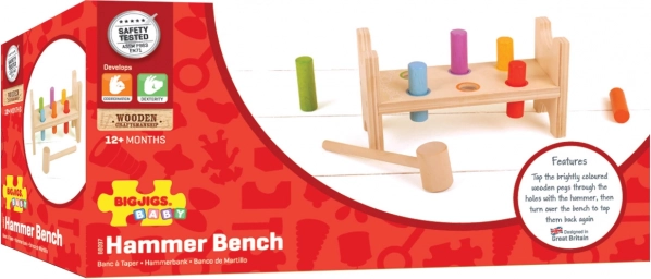 Táto klasická drevená zatĺkačka značky Bigjigs Baby nadchne deti jednoduchým princípom – kolíky sa kladivkom zatĺkajú do otvorov, potom stačí lavičku otočiť a zábava sa môže začať znova. Jasné farby podnecujú vnímanie a podporujú sústredenie.