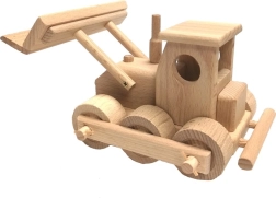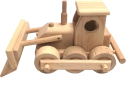Buldozér ponúka realistickú hru vďaka pohyblivej prednej radlici a spoľahlivo sa otáčajúcim dreveným kolieskam.
