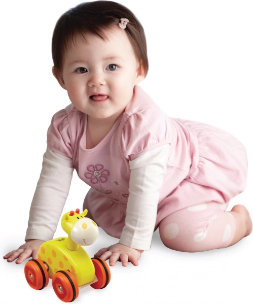 Táto veselá žirafa na kolieskach je ideálne prvé vozítko do detských rúk. Naklonením hračky dieťa ľahko mení smer jazdy, čo prirodzene rozvíja koordináciu oko–ruka a podporuje aktívnu hru. Gumové krúžky na kolieskach zabezpečujú plynulý a tichý chod na rôznych povrchoch.