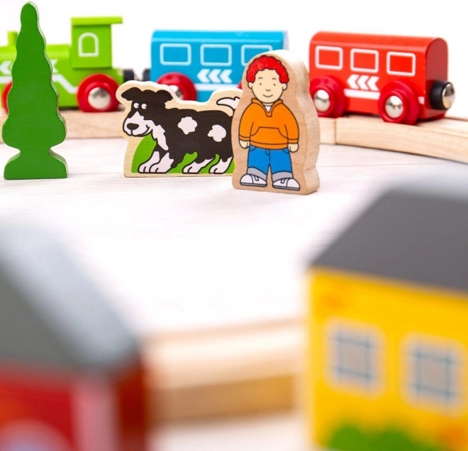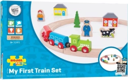 - 8× drevené koľaje, 1× lokomotíva, 2× vagónik s magnetickými spojkami, 8× doplnky (domy, stromy, postavy)