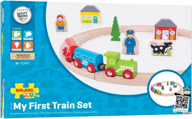 Objavte kúzlo prvých jázd s touto farebnou drevenou vláčikodráhou od BIGJIGS RAIL. Sada obsahuje 19 dielov vrátane lokomotívy, vagónikov, magnetických spojok a doplnkov ako domy, stromy a postavičky. Vhodná pre deti od 3 rokov, podporuje predstavivosť, jemnú motoriku a koordináciu. Vyrobené z kvalitných, zodpovedne získaných materiálov a kompatibilné s väčšinou drevených vláčikodrâh na trhu.