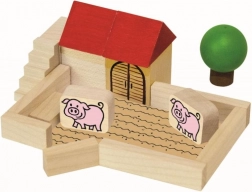 Táto drevená stavebnica obsahuje rôzne tvary, farby a veľkosti dielcov, ktoré deťom umožňujú tvoriť vlastnú farmársku scenériu. Diely potlačené atraktívnymi ikonami predstavujú vidiecke motívy, najmä zvieracie figúrky, a tým podporujú detskú kreativitu.