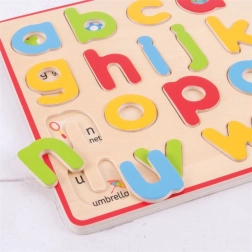 Zábavná drevená doska s anglickou malou abecedou pomáha deťom hravou formou spoznať tvary písmen a ich poradie. Každé písmeno je zapustené do podkladovej dosky a doplnené ilustráciou predmetu na dané písmeno, čo podporuje vizuálne učenie. Vyrobená z kvalitného dreva a spĺňa európske normy. Rozvíja obratnosť, koncentráciu a komunikačné zručnosti.