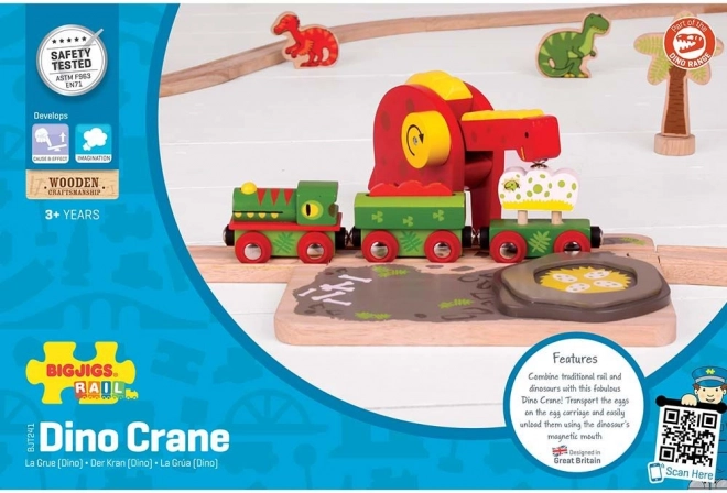Dinosauří žeriav Bigjigs Rail prináša na vašu drevenú vláčikodráhu dávku dobrodružstva. Deti pomocou pohyblivého krku dinosaura a magnetu premiestňujú dinosauřie vajce na priložený vagónik a trénujú koordináciu ruka–oko. Pestrofarebné prevedenie a pevná drevená konštrukcia lákajú k fantazijnej hre, ktorá vydrží.