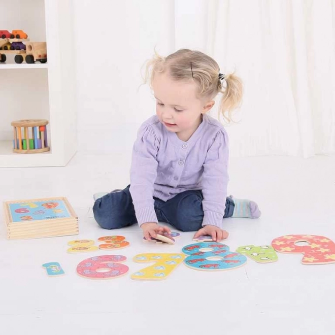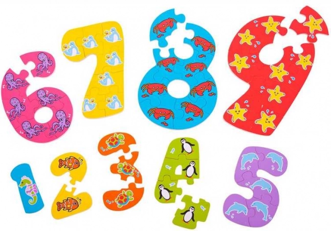 Táto sada vzdelávacích puzzlí učí deti rozpoznávať číslice a priraďovať k nim množstvo. Každé číslo sa skladá zo zodpovedajúceho počtu dielikov (napr. číslo 4 má štyri dieliky) s veselým zvieracím motívom, čo podporuje prirodzené učenie aj radosť zo skladania.